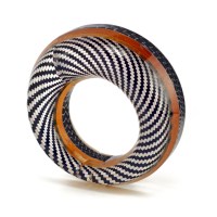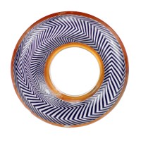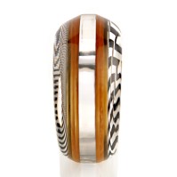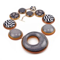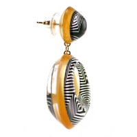For this collection I chose to work with op art. I love how a static image can appear to have movement and I wanted to use the layered acrylic process to further manipulate this movement and accentuate the optical effects. To accomplish this I chose to work with rounded shapes and sculpt the acrylic into domed forms. The imagery reflects through the curves and becomes further distorted. As you view each piece from various angles the imagery distorts in different ways and accentuates the movement of the op art. The images come to life and have a luscious feel that I wanted to play up by pairing it with gold. The vibrant amber colors radiating from the layers of 23k gold leaf ad a richness and warmth that juxtapose the black and white graphics and the simple acrylic and paper materials.